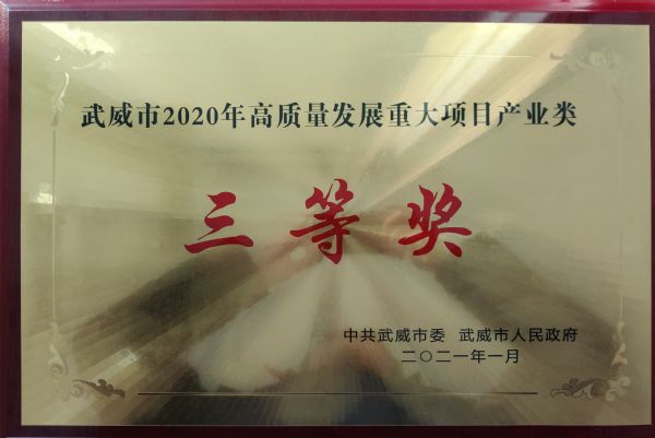 2021年1月5日,在武威市召開的武威市委四屆十四次全會暨市委經(jīng)濟(jì)工作會議第二次大會上,甘肅普安制藥股份有限公司的“宣肺止嗽合劑擴(kuò)產(chǎn)改造項目”榮獲“武威市2020年高質(zhì)量發(fā)展重大項目產(chǎn)業(yè)類”三等獎,并獲得獎勵100萬元。