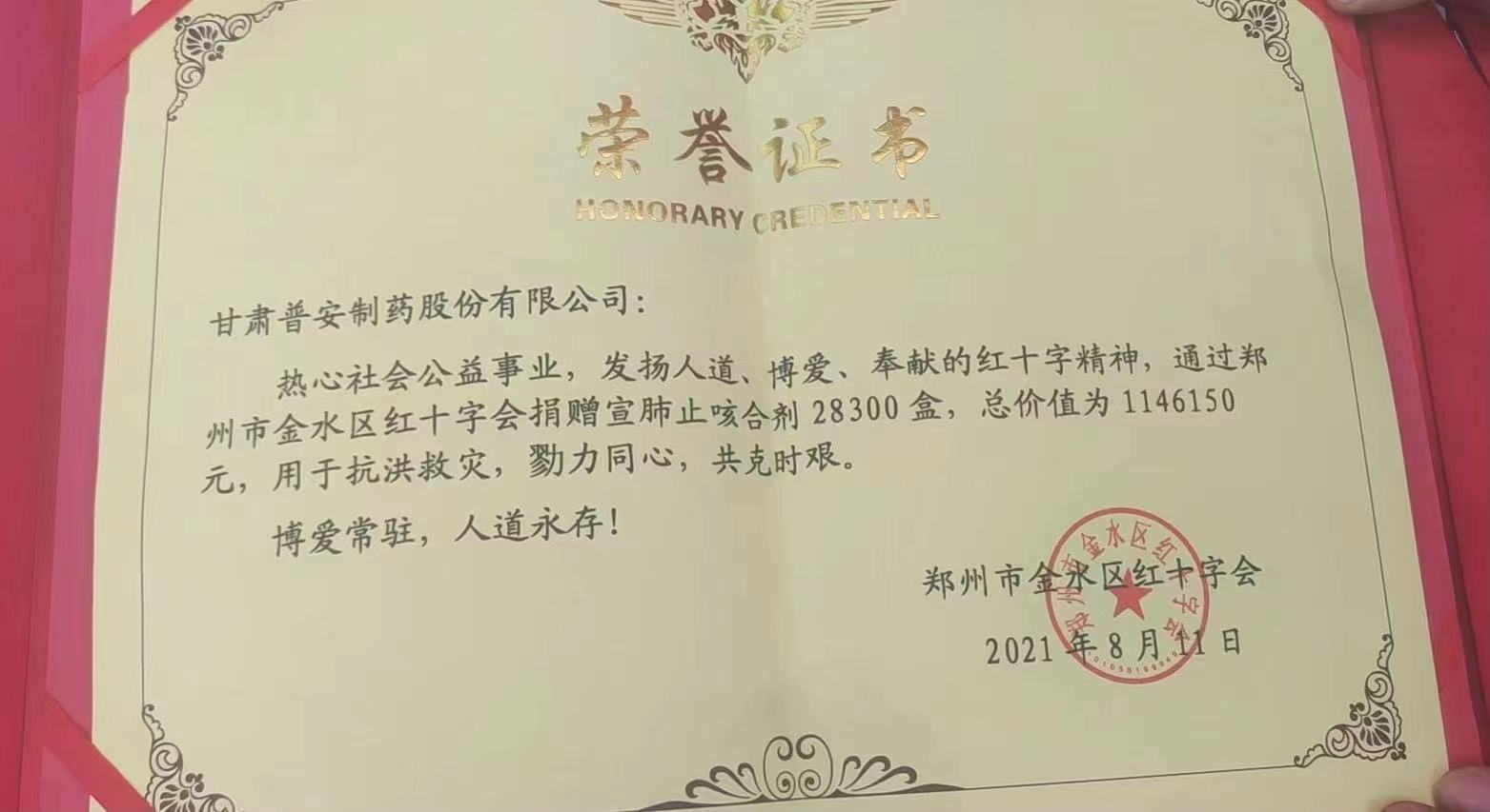 近期,國內多地相繼發生新冠疫情,疫情防控形勢非常嚴峻、復雜,而河南省多地又受到洪澇災害影響,洪澇災害后面臨著災情、疫情雙重挑戰。為履行社會責任,彰顯“一方有難,八方支援”的擔當,作為國有企業,甘肅藥業集團普安制藥會同中華中醫藥學會第一時間組織抗疫物資的捐贈(價值114.6萬元的藥品)供災后防疫使用,助力河南省做好災后疫情防控工作。