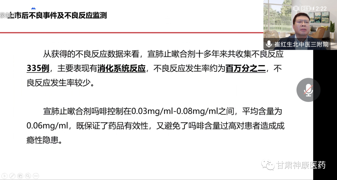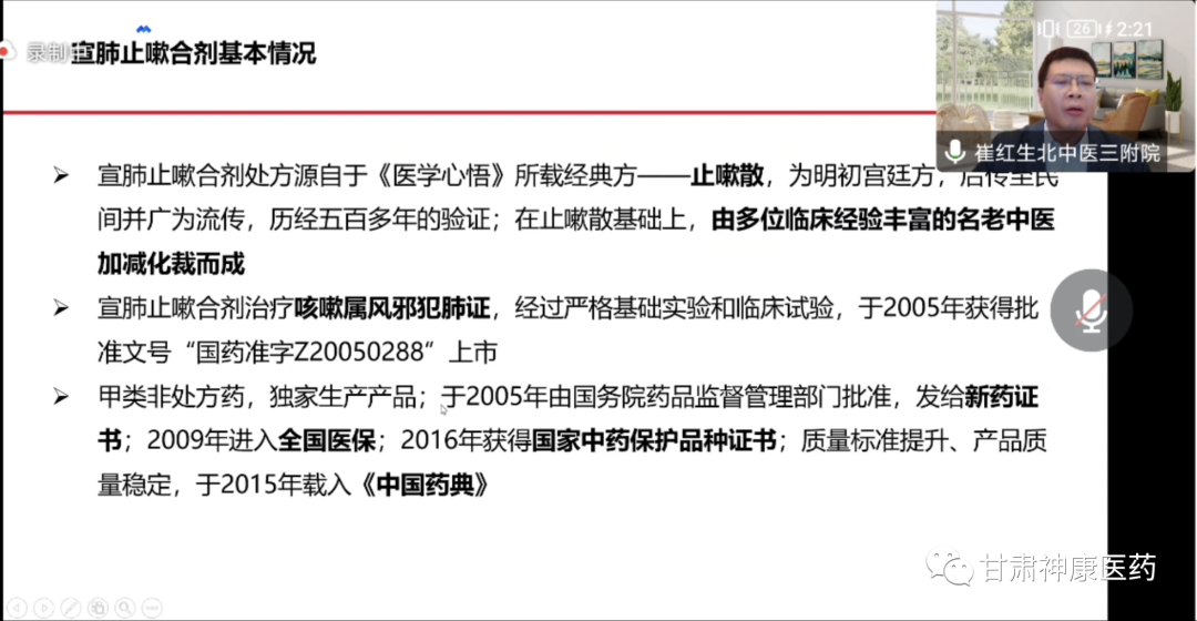 會(huì)上,由北京中醫(yī)藥大學(xué)第三附屬醫(yī)院崔紅生教授對(duì)宣肺止嗽合劑處方來(lái)源、獲獎(jiǎng)專利、安全性等做了詳細(xì)的介紹。