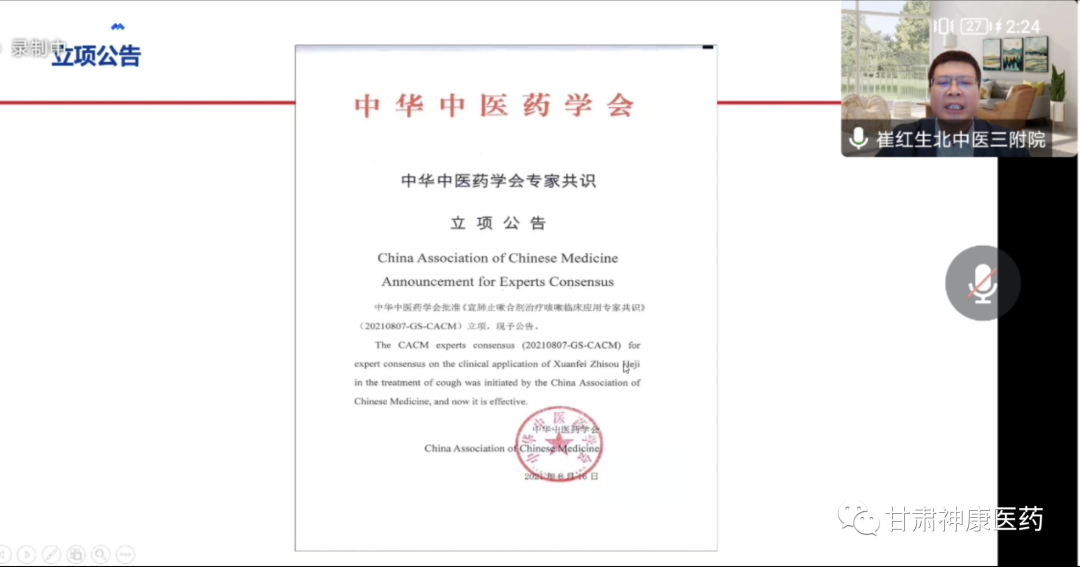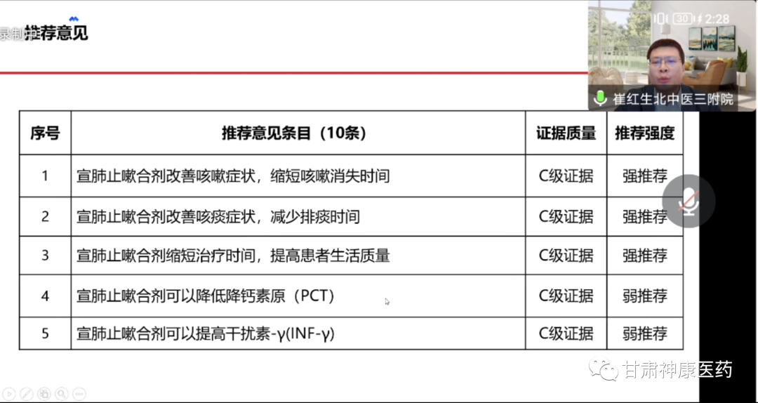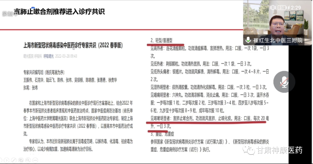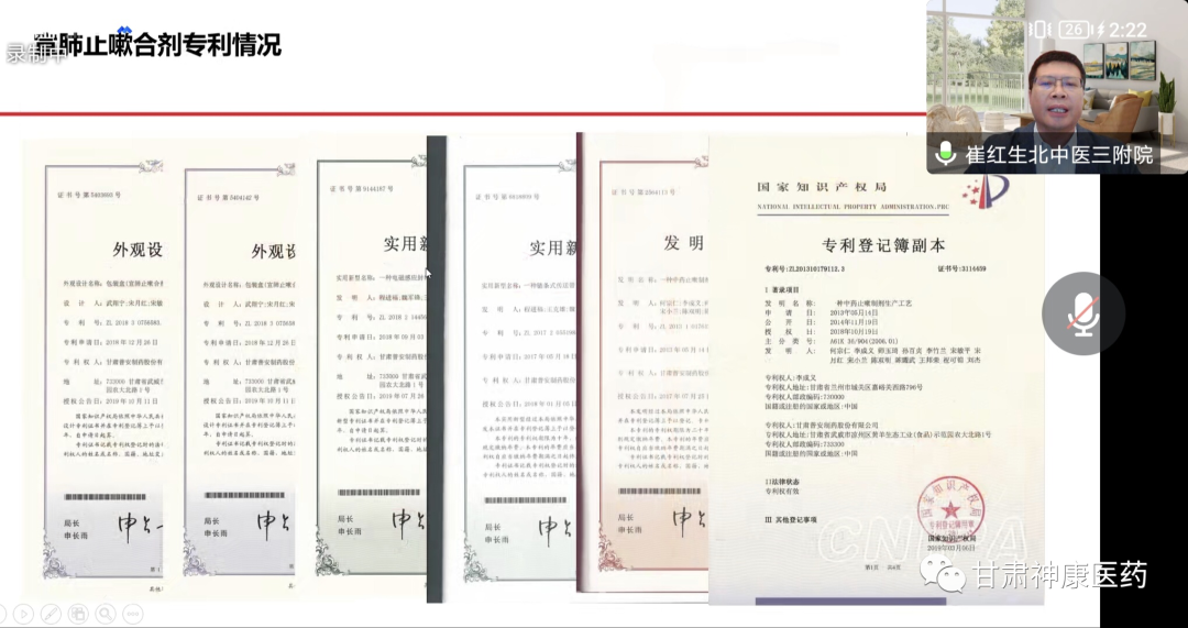 最后,崔教授對(duì)宣肺止嗽合劑在新冠肺炎疫情防控中展示出了獨(dú)特的治療價(jià)值和國(guó)藥魅力做了介紹,宣肺止嗽合劑在2022年3月,分別被列入《上海市新型冠狀病毒感染中醫(yī)藥診療專家共識(shí)》(2022年春季版)與《甘肅省新型冠狀病毒肺炎中醫(yī)藥防治方案(第四版)》。并于2022年5月,在上海中醫(yī)藥大學(xué)附屬曙光醫(yī)院開展了宣肺止嗽合劑治療新型冠狀病毒肺炎真實(shí)世界的相關(guān)研究,為后期循證證據(jù)搭建提供研究思路。