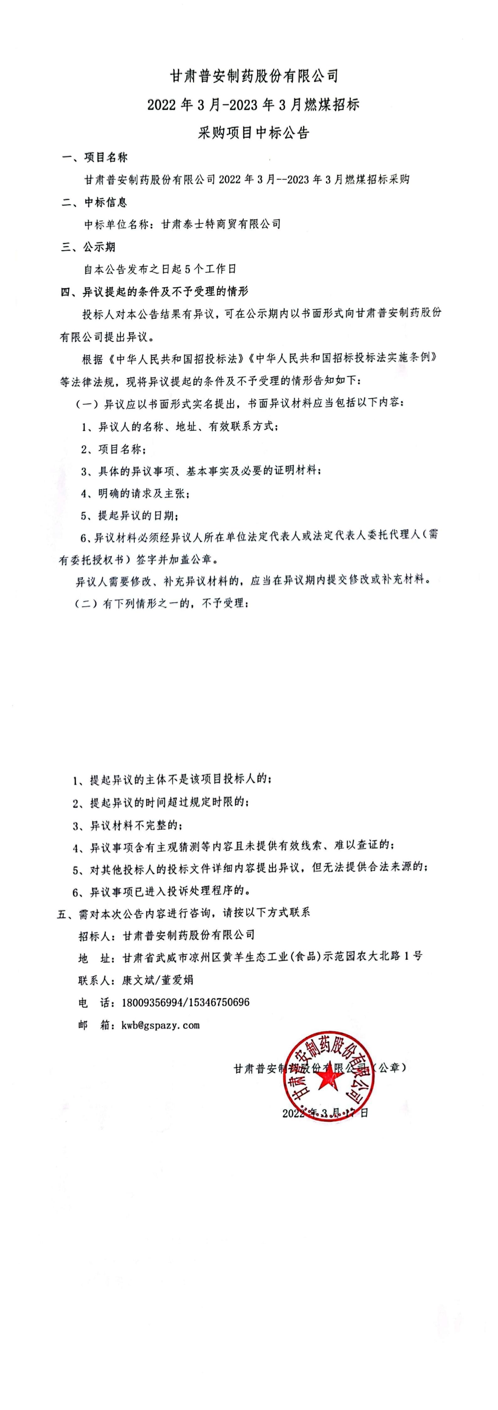 甘肅普安制藥股份有限公司2022年3月-2023年3月燃煤招標采購項目中標公告