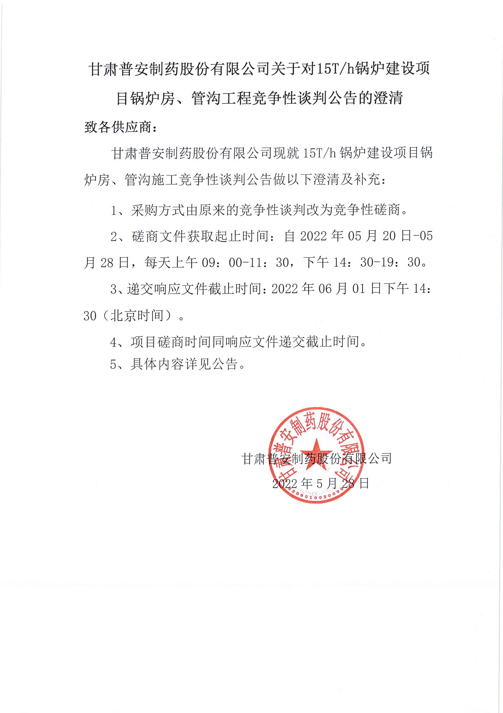 甘肅普安制藥股份有限公司關(guān)于對15T/h鍋爐建設項目鍋爐房、管溝工程競爭性談判公告的澄清