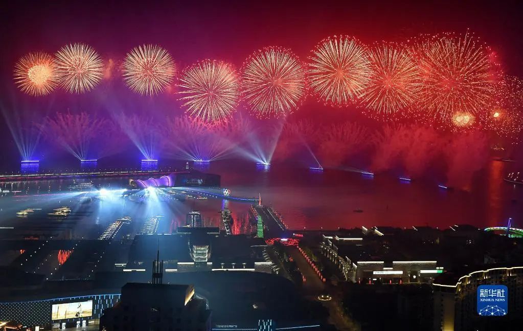 這是上合組織青島峰會期間舉行的《有朋自遠方來》燈光焰火藝術(shù)表演(2018年6月9日攝)。新華社記者 李紫恒 攝