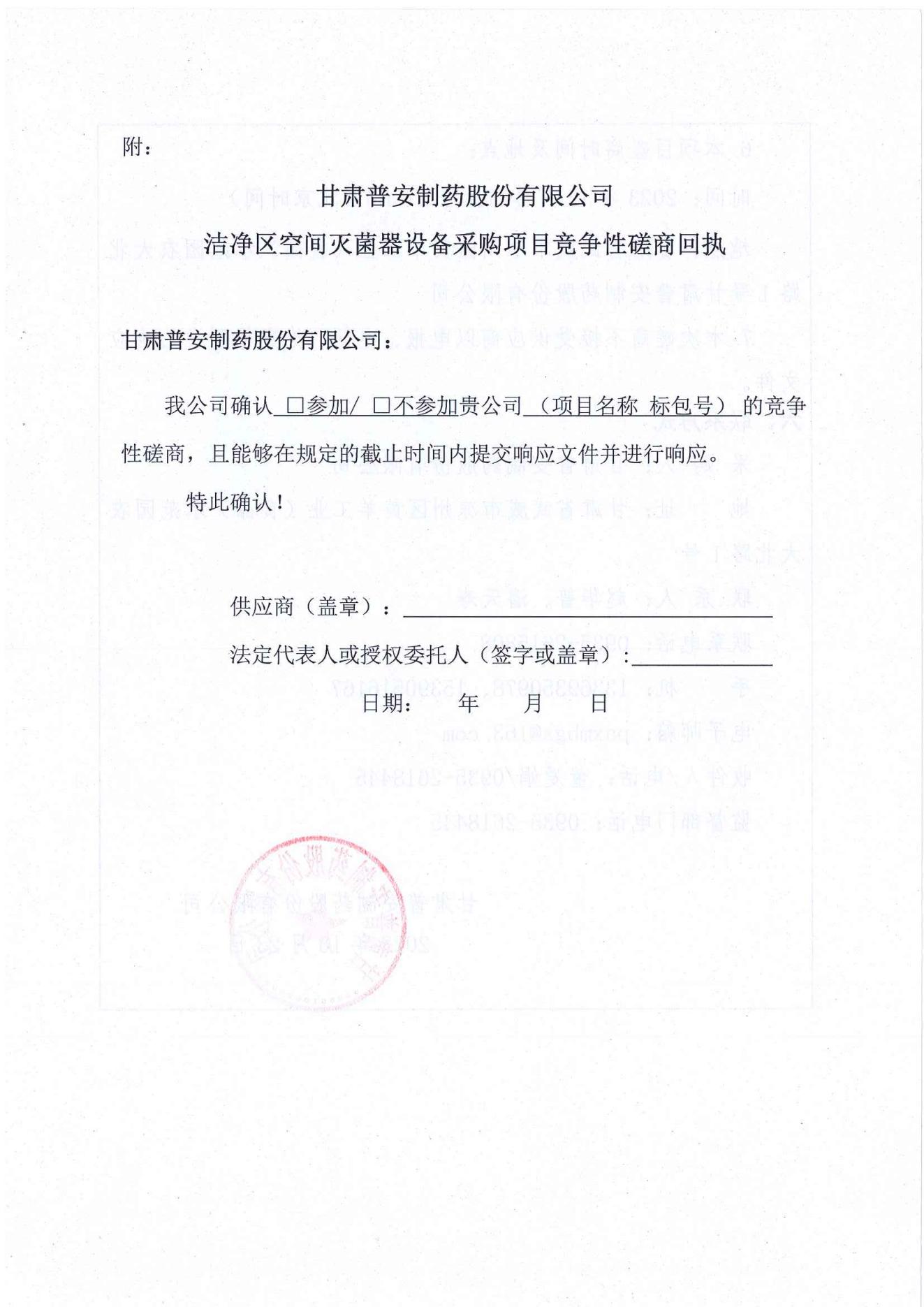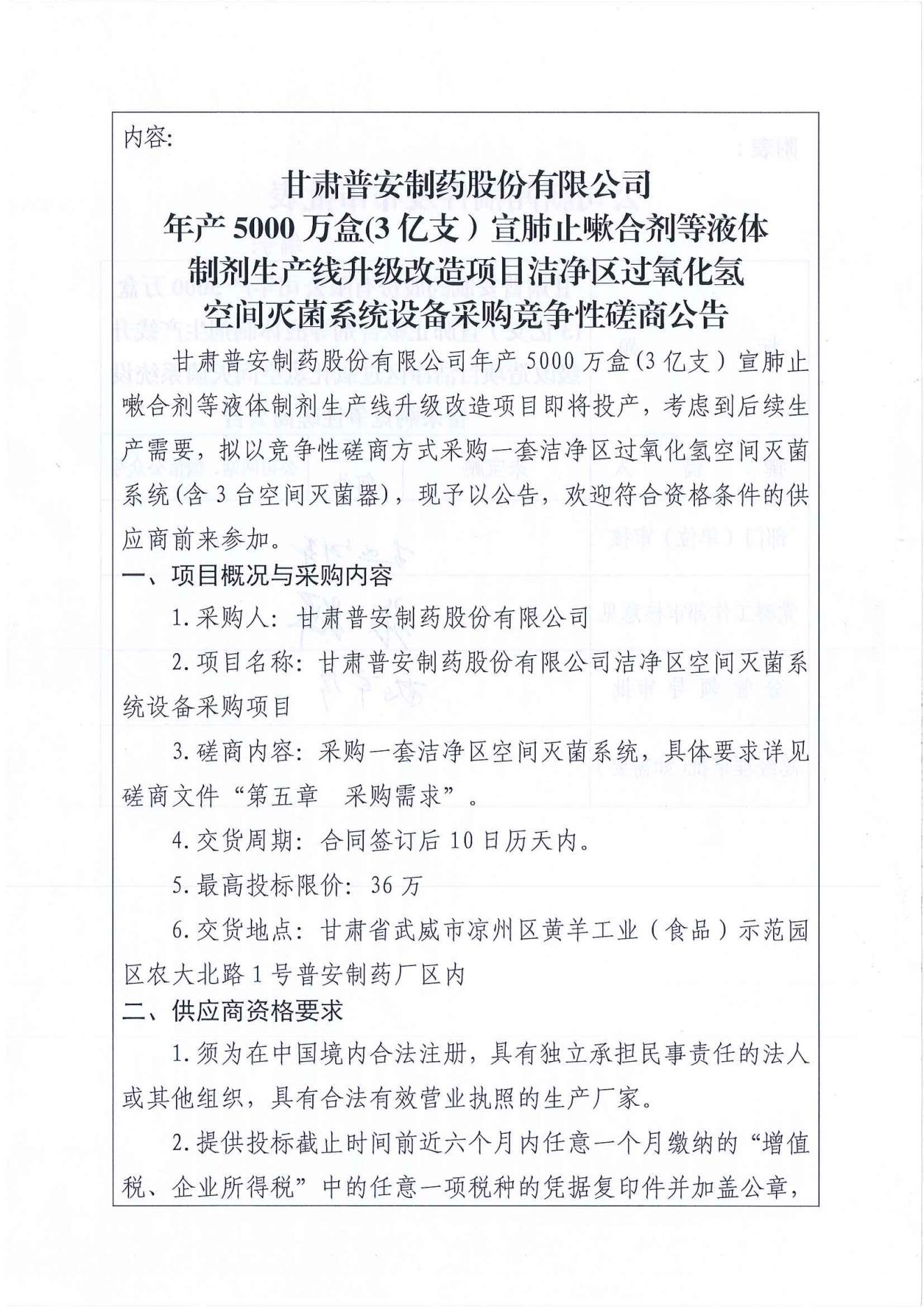 甘肅普安制藥股份有限公司年產(chǎn)5000 萬盒(3億支)宣肺止嗽合劑等液體制劑生產(chǎn)線升級改造項目潔凈區(qū)過氧化氫空間滅菌系統(tǒng)設備采購競爭性磋商公告