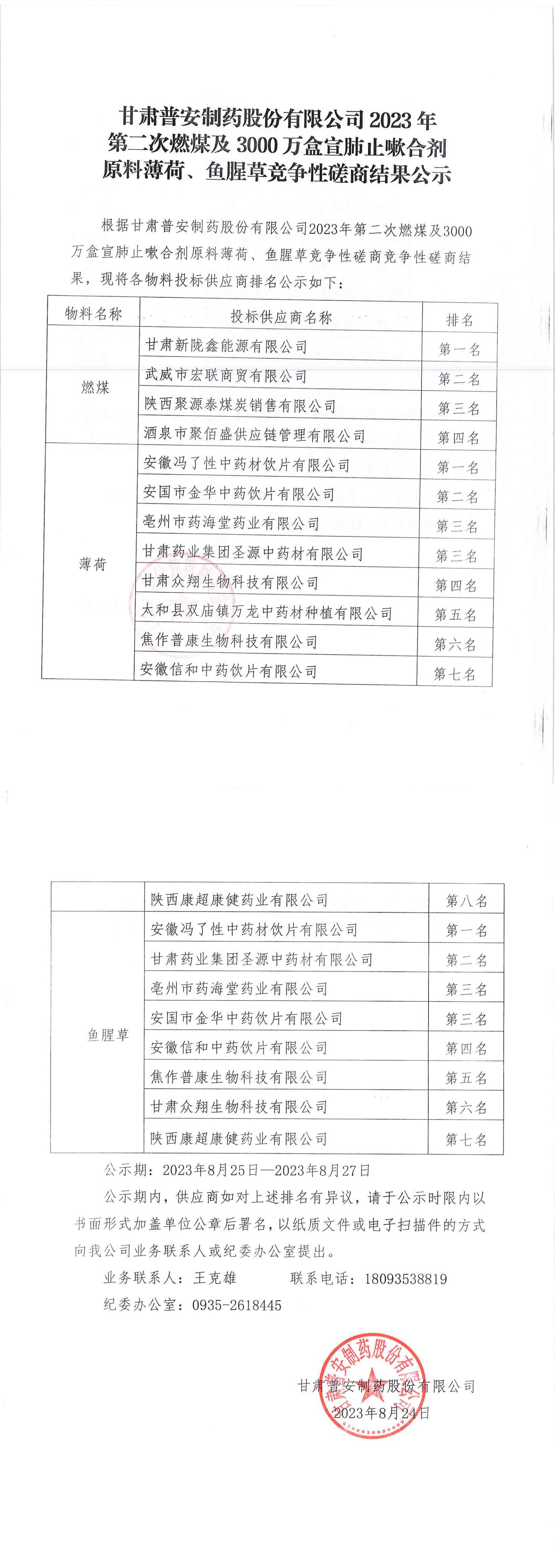 甘肅普安制藥股份有限公司2023年第二次燃煤及3000萬盒宣肺止嗽合劑原料薄荷、魚腥草競(jìng)爭(zhēng)性磋商結(jié)果公示