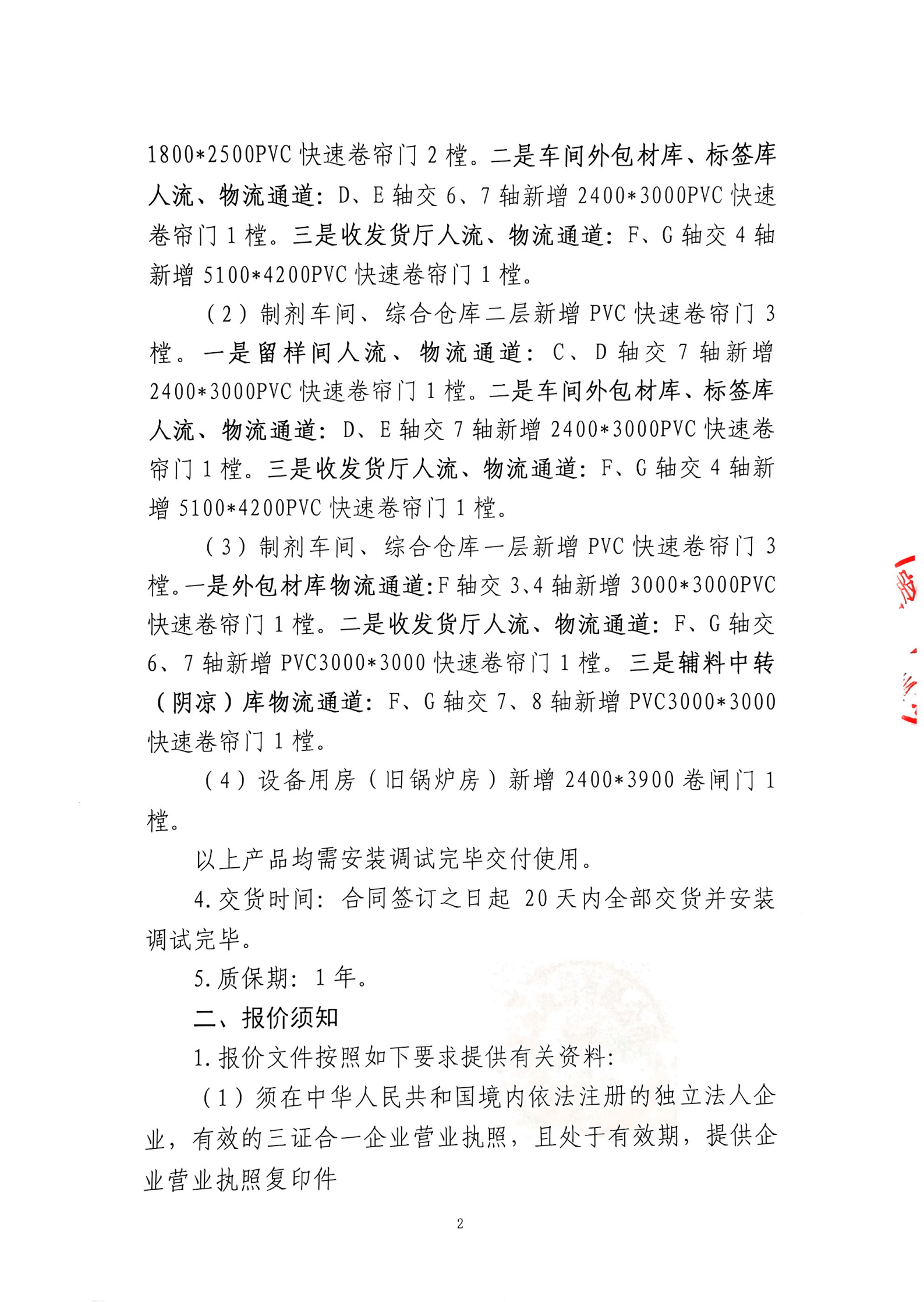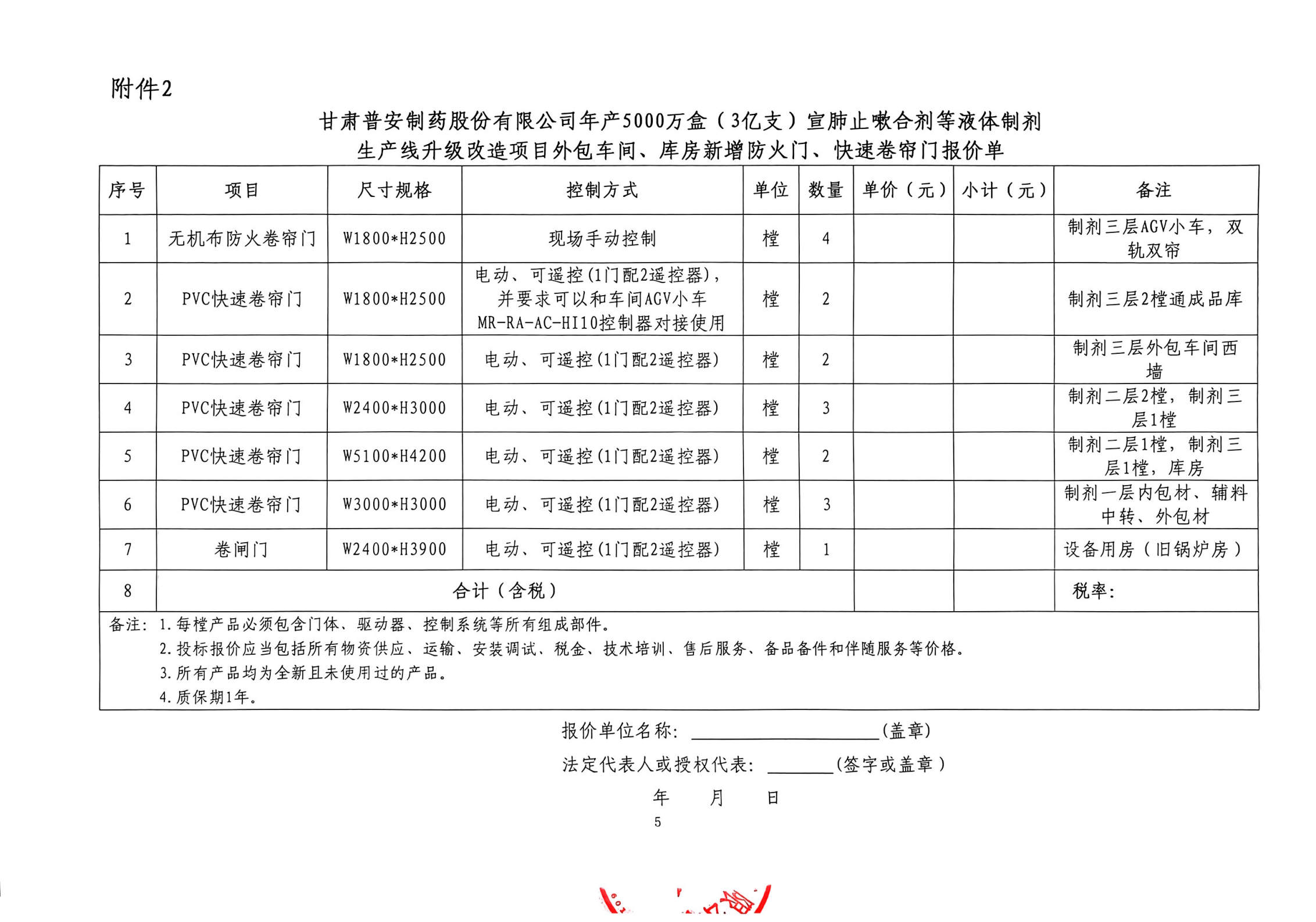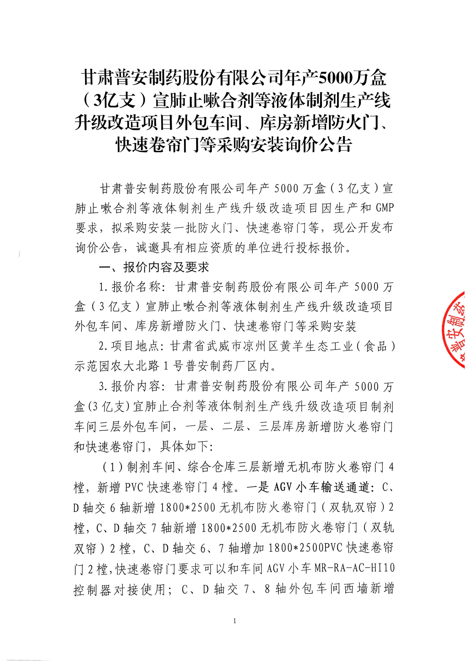 甘肅普安制藥股份有限公司年產5000萬盒(3億支)宣肺止嗽合劑等液體制劑生產線升級改造項目外包車間、庫房新增防火門、快速卷簾門等采購安裝詢價公告