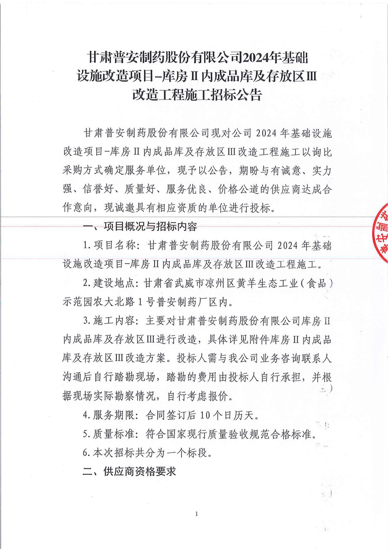 甘肅普安制藥股份有限公司2024年基礎設施改造項目-庫房Ⅱ內成品庫及存放區Ⅲ改造工程施工招標公告