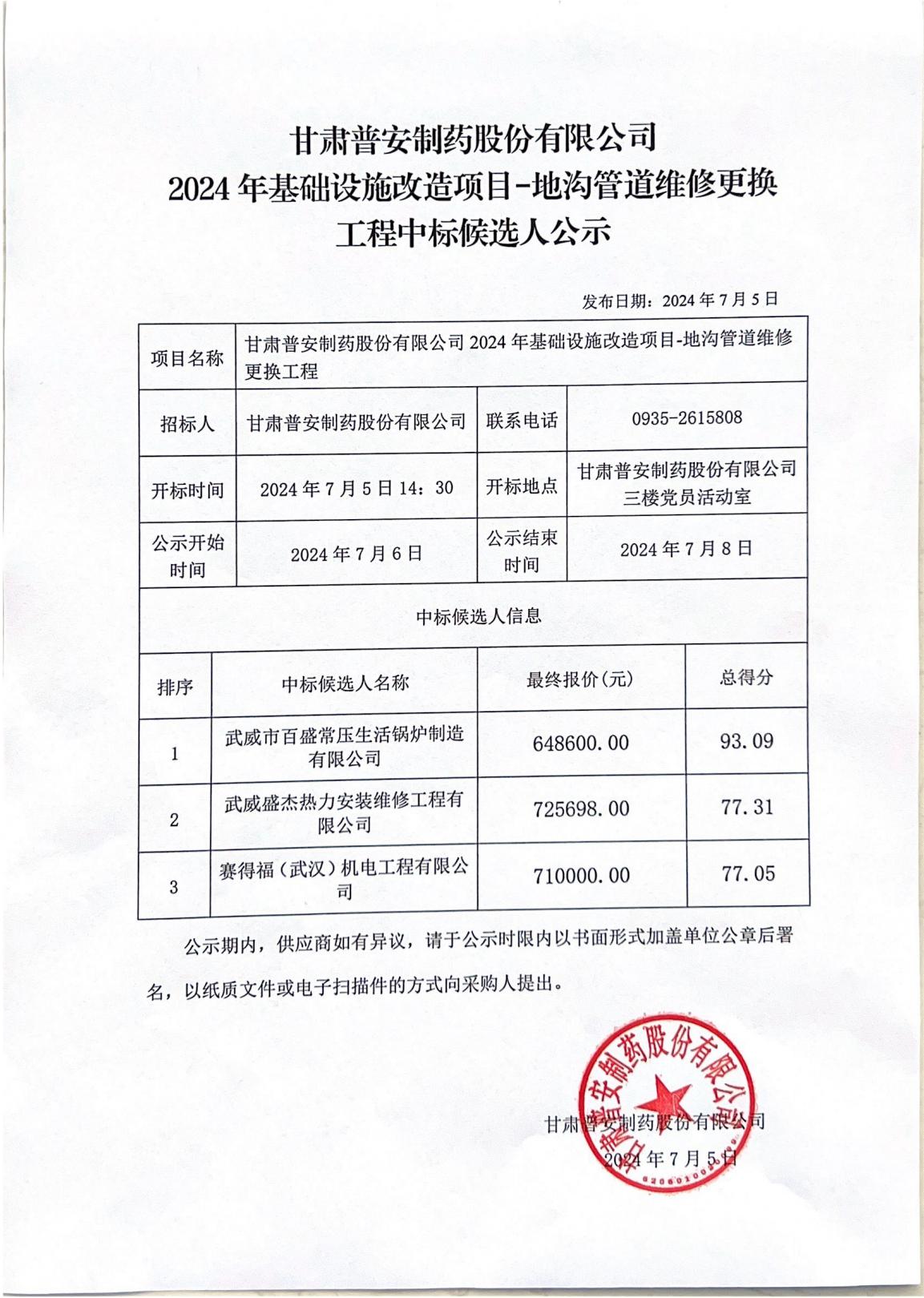 甘肅普安制藥股份有限公司2024年基礎(chǔ)設(shè)施改造項目-地溝管道維修更換工程中標候選人公示