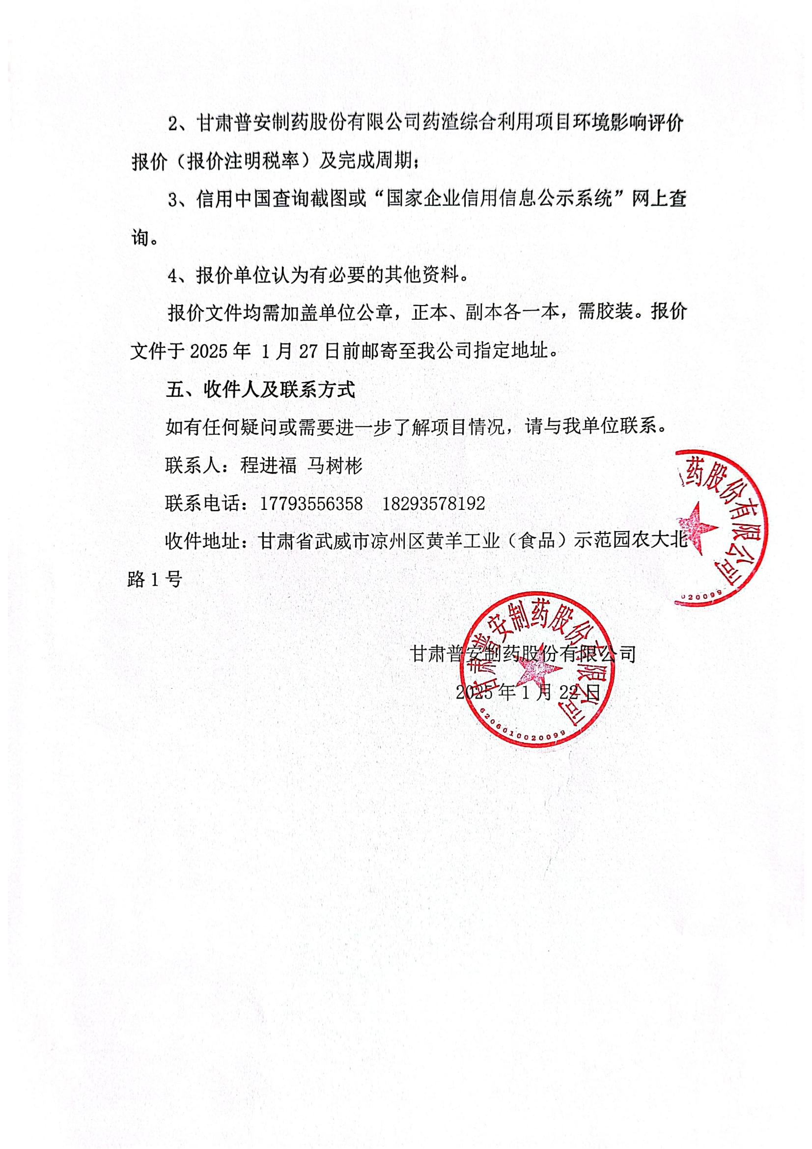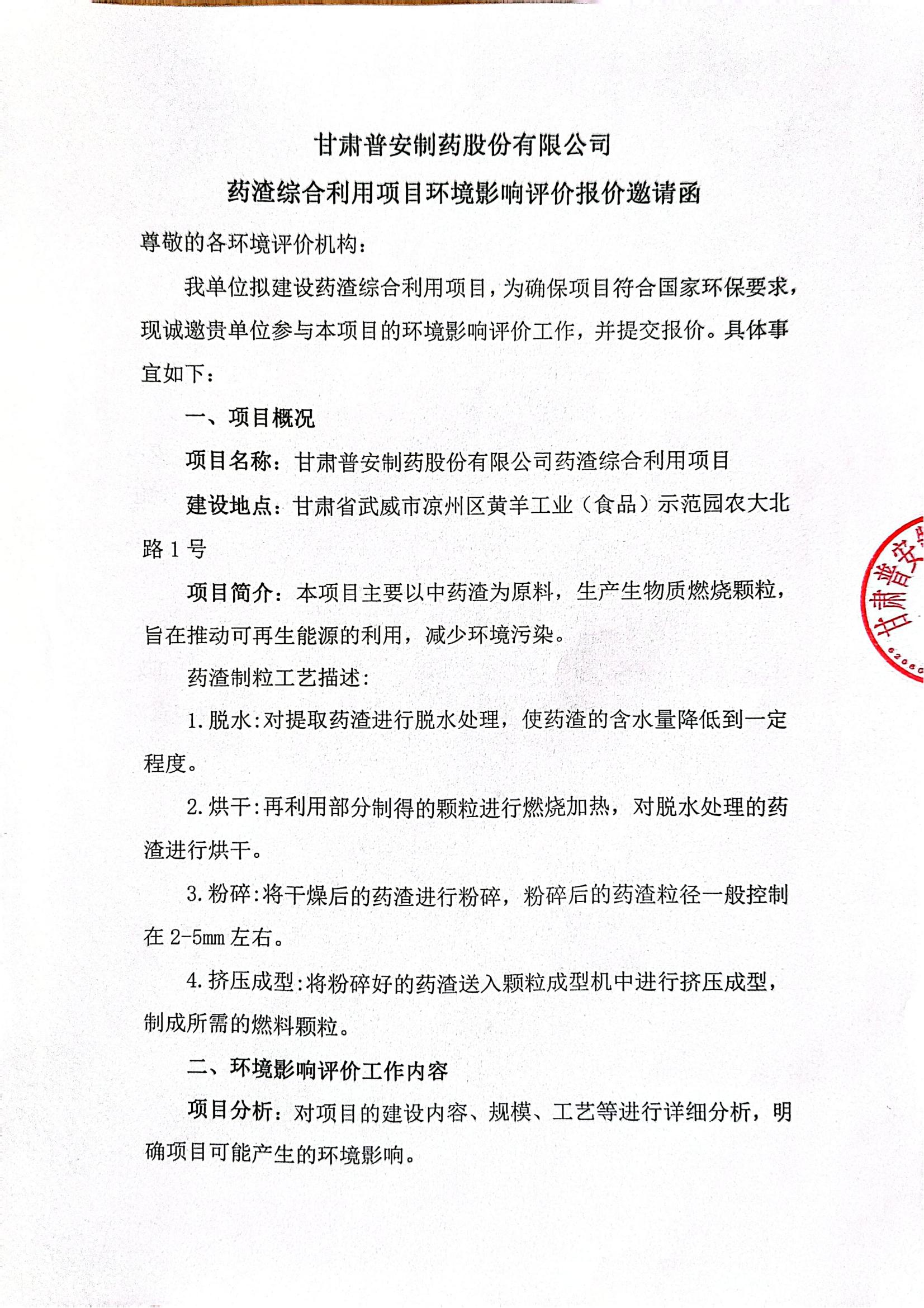 甘肅普安制藥股份有限公司藥渣綜合利用項目環境影響評價報價邀請函