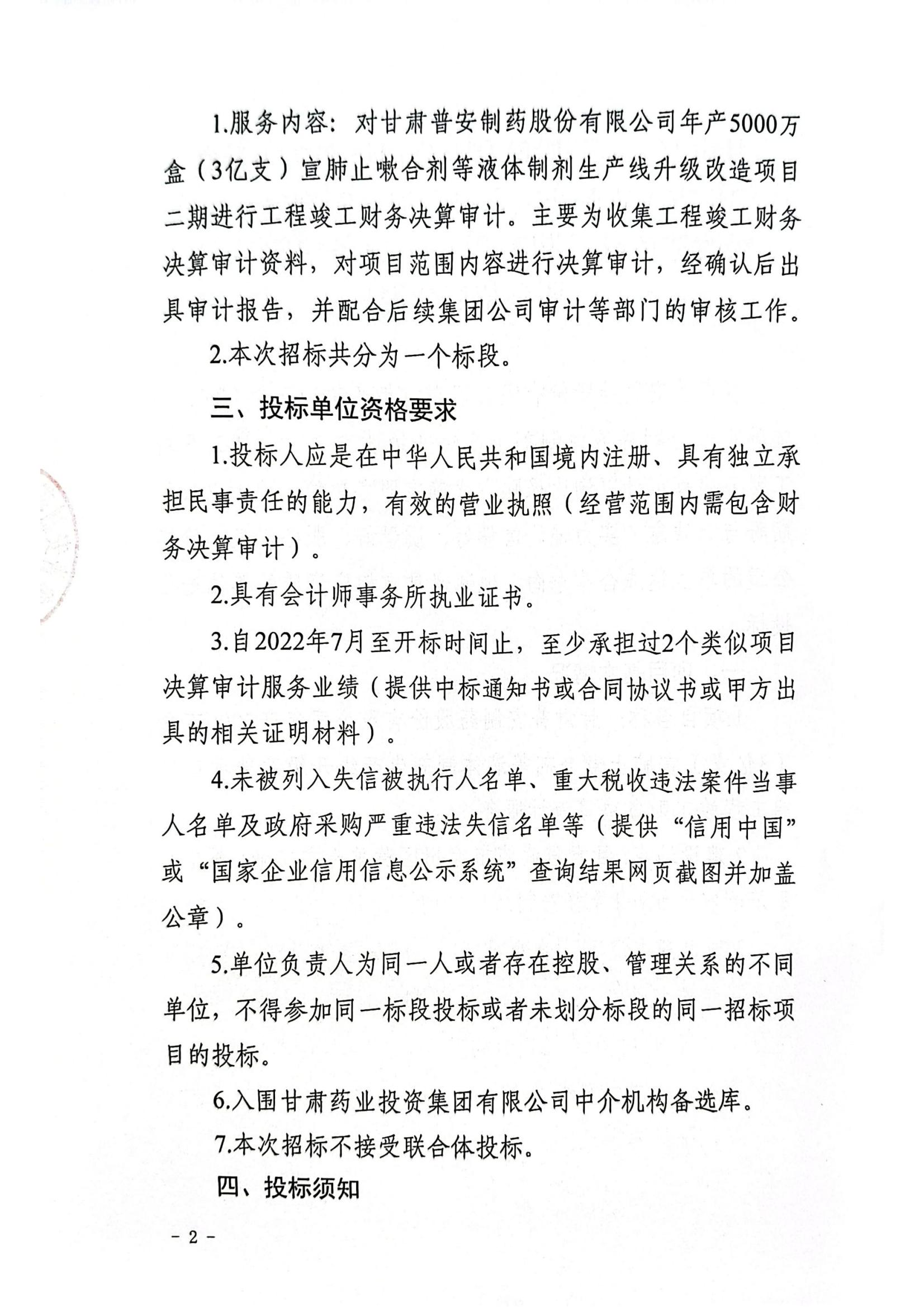 甘肅普安制藥股份有限公司年產(chǎn)5000萬(wàn)盒宣肺止嗽合劑等液體制劑生產(chǎn)線升級(jí)改造項(xiàng)目二期竣工決算審計(jì)服務(wù)招標(biāo)公告